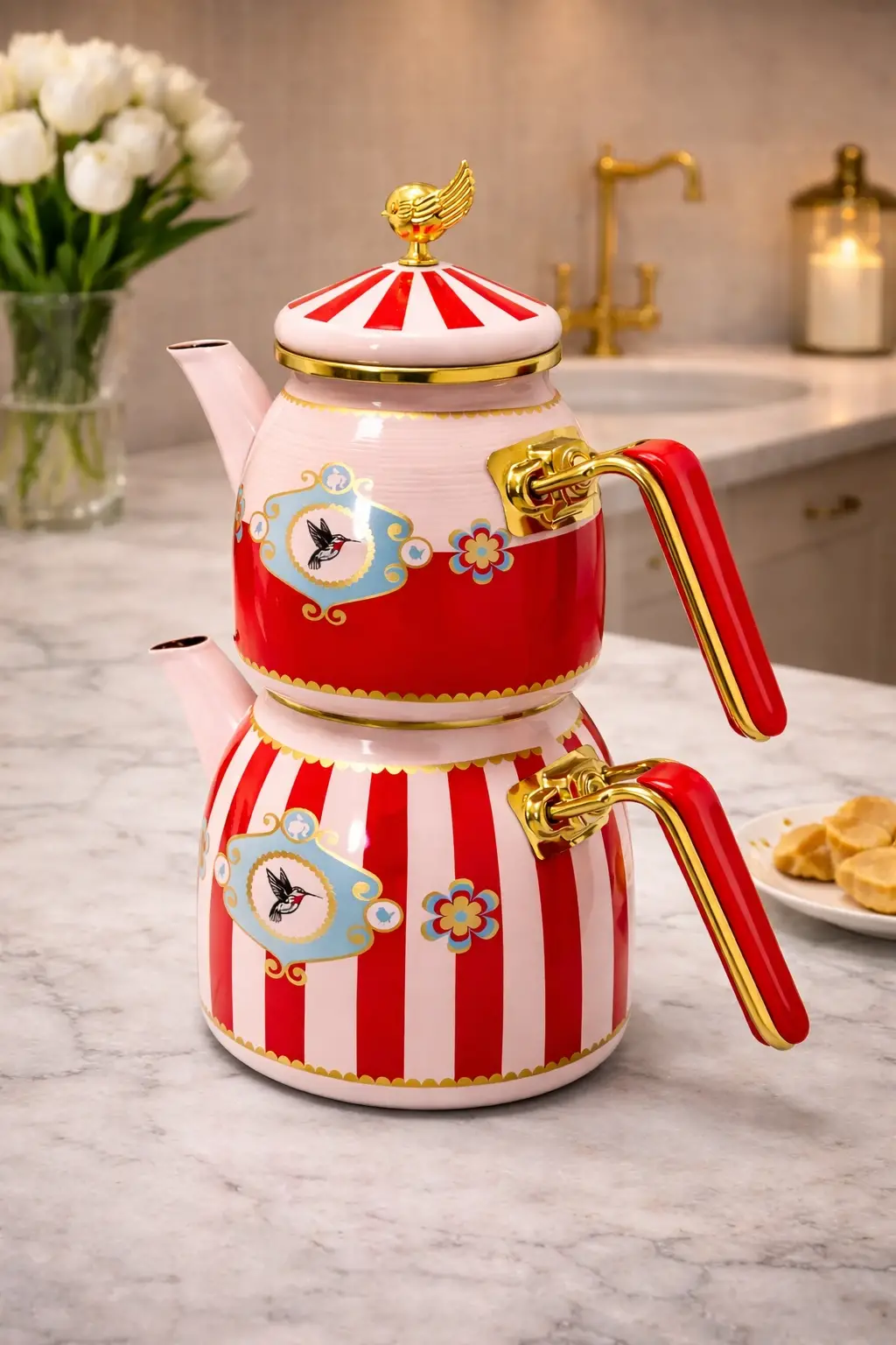 Set İçeriği: Dekorlu Çaydanlık Alt 1 Adet, Dekorlu Çaydanlık Üst 1 Adet, Dekorlu Tepeli Emaye Çaydanlık Kapağı 1 Adet.