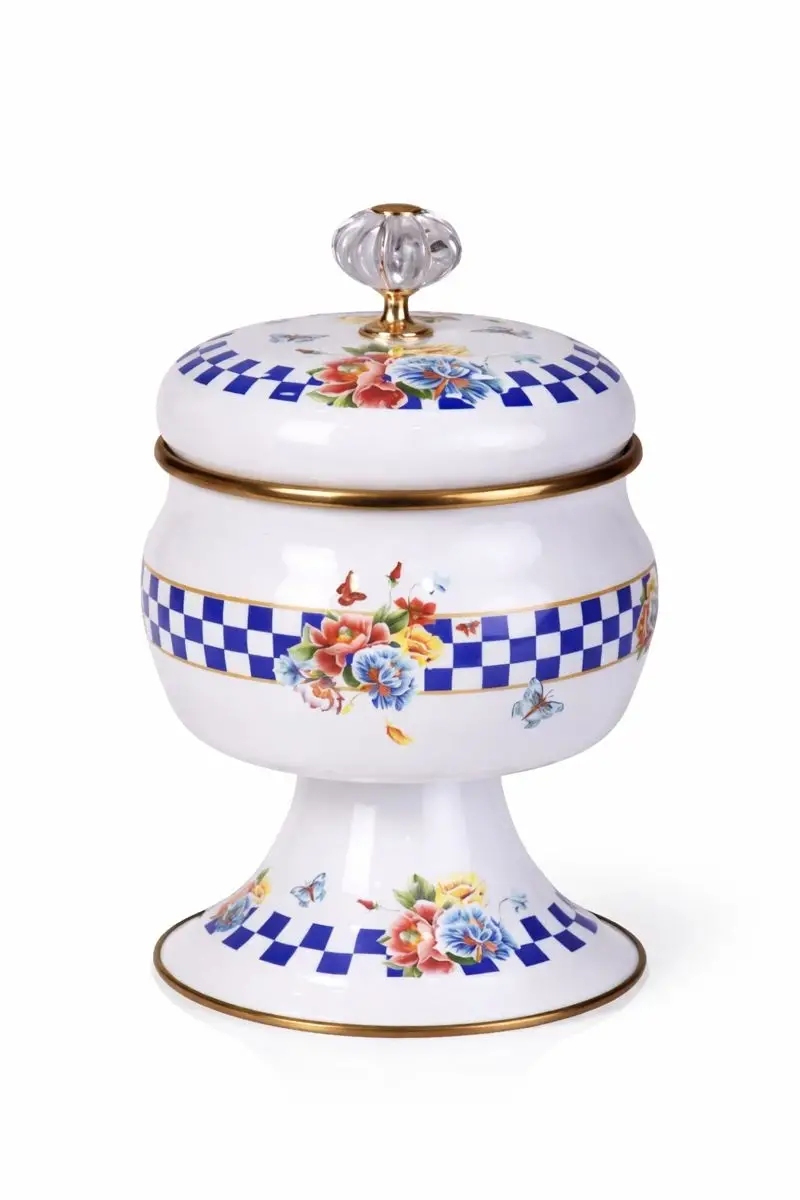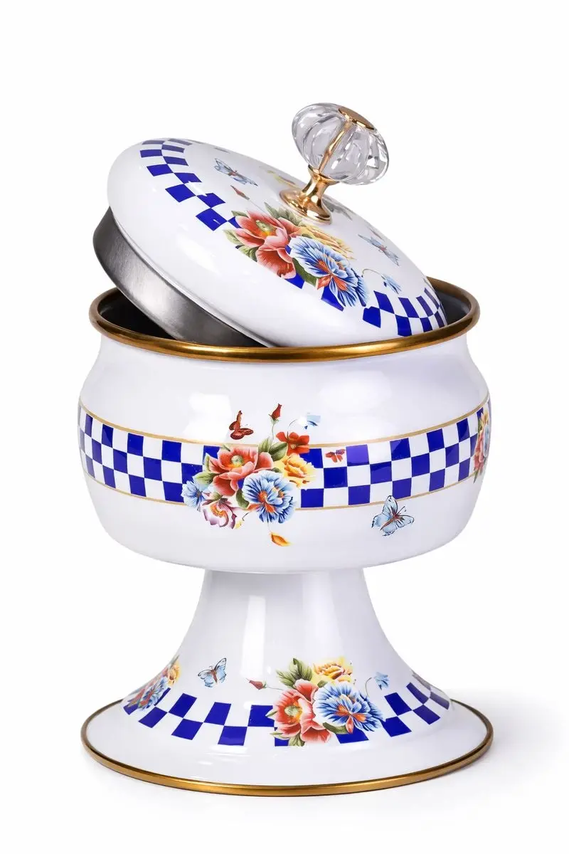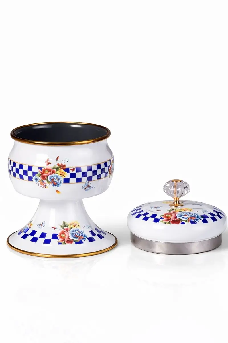 Set İçeriği: Dekorlu Ayaklı Şekerlik 1 Adet, Dekorlu Tepeli Emaye Kapak 1 Adet
