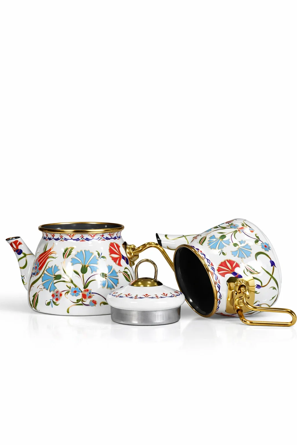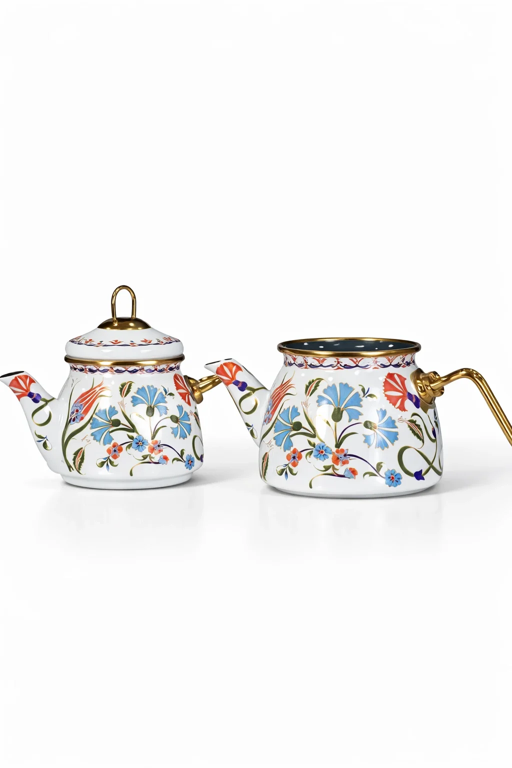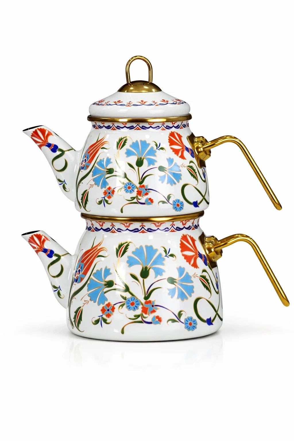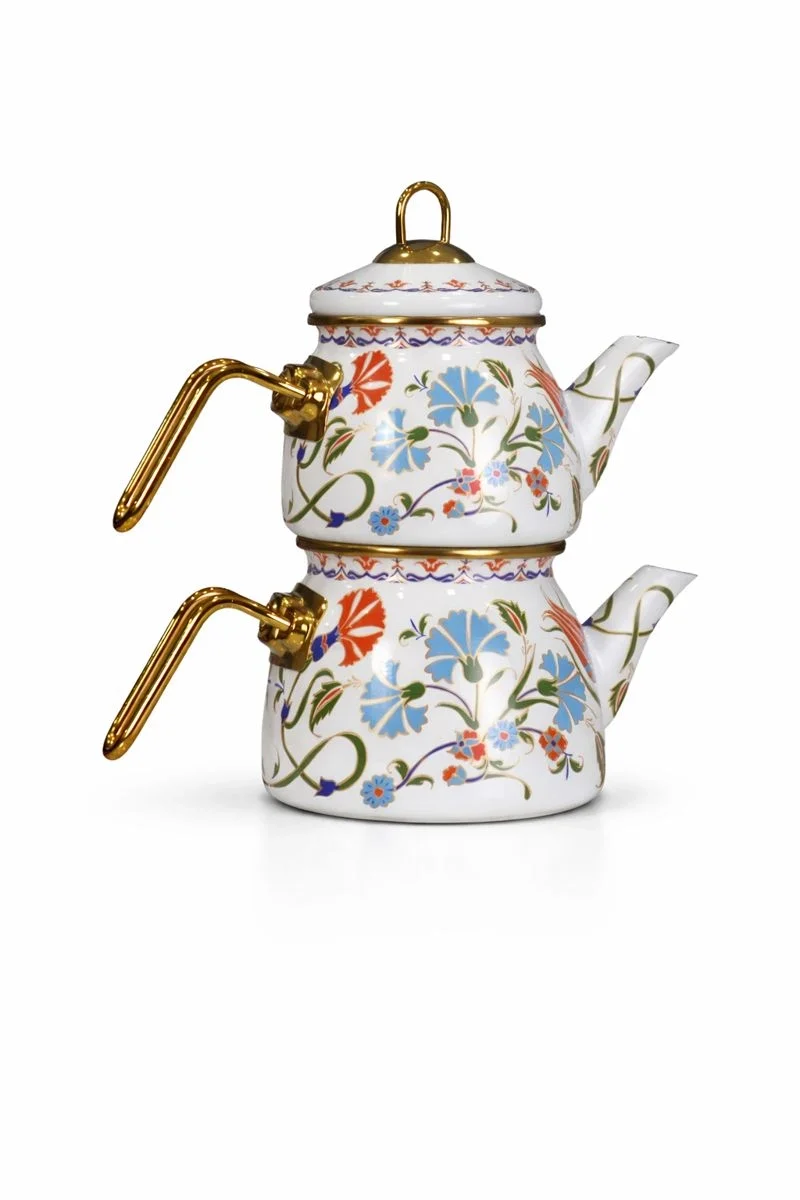 Set İçeriği: Dekorlu Çaydanlık Alt 1 Adet, Dekorlu Çaydanlık Üst 1 Adet, Dekorlu Tepeli Emaye Çaydanlık Kapağı 1 Adet.