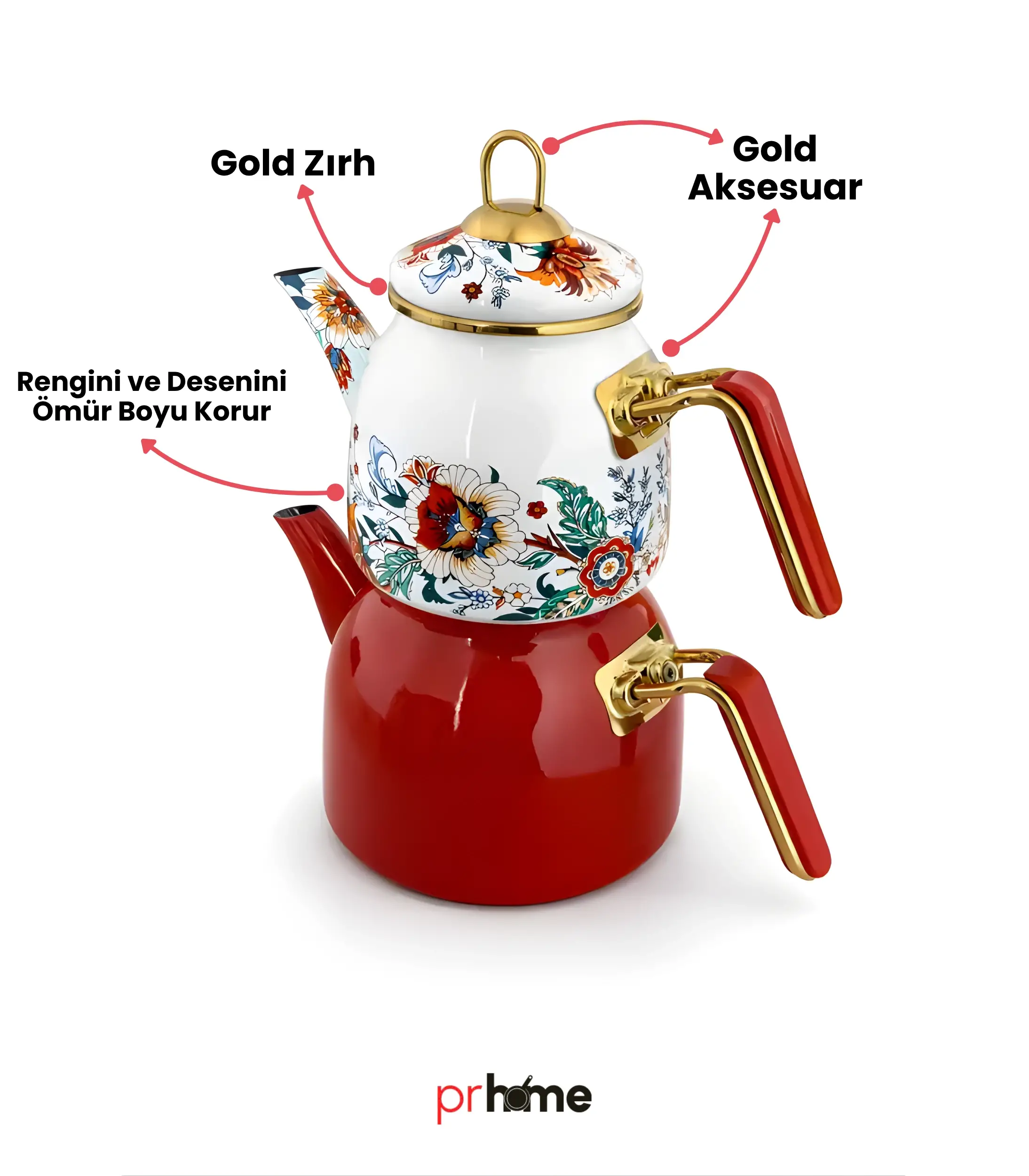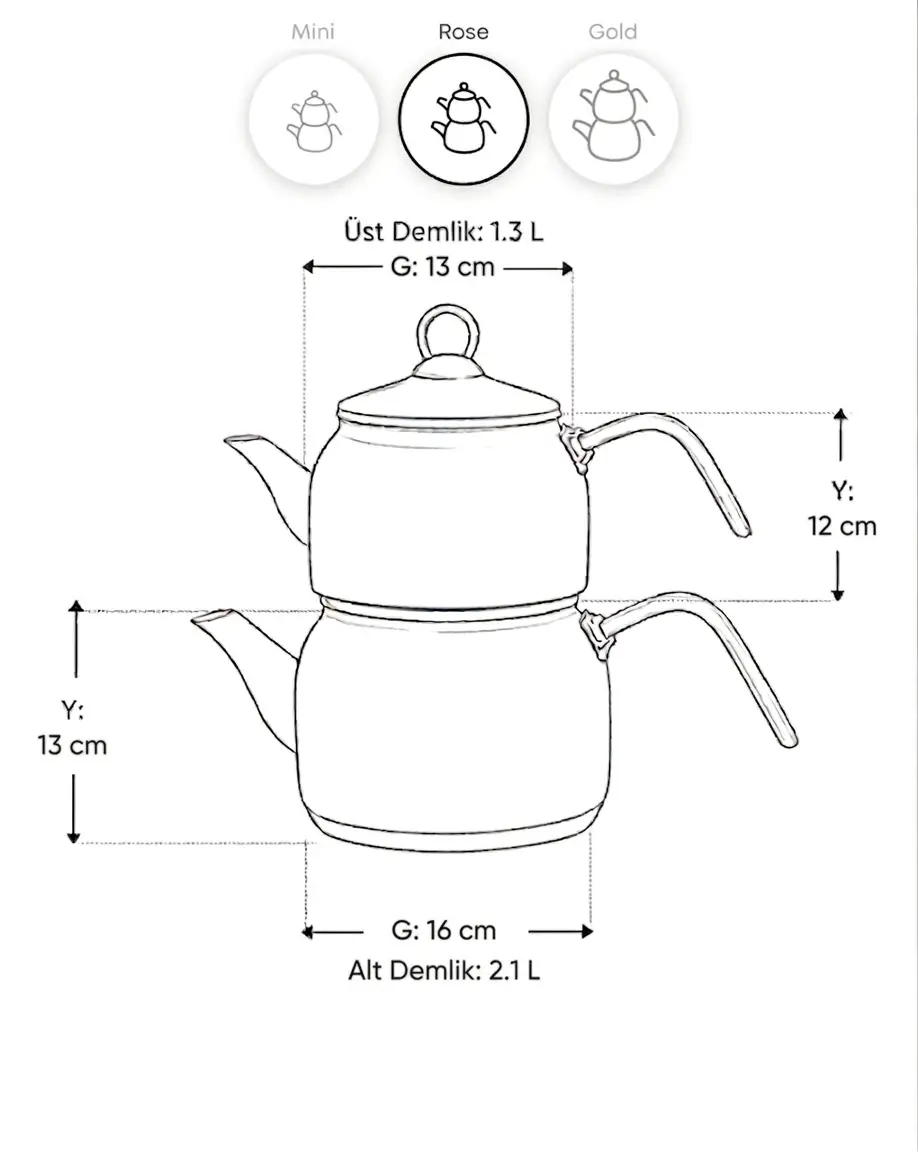 Set İçeriği: Düz Renk Çaydanlık Alt 1 Adet, Desenli Çaydanlık Üst 1 Adet, Desenli Tepeli Emaye Çaydanlık Kapağı 1 Adet.